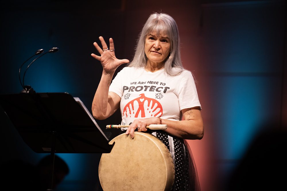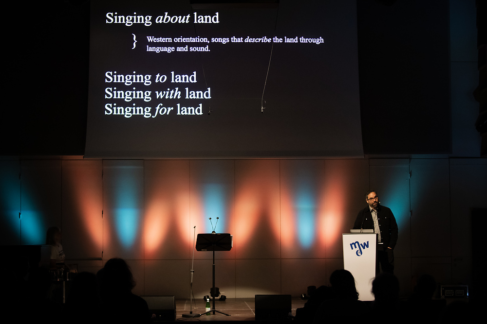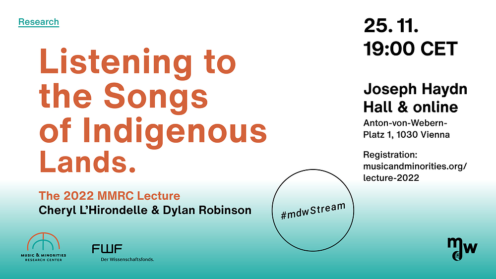 Fusing scholarly and artistic approaches, Dylan Robinson and Cheryl L'Hirondelle will explore the manifold dimensions of sound art by North American Indigenous artists and Indigenous song. The evening will feature works by Raven Chacon, Rebecca Belmore and Tania Willard. L’Hirondelle and Robinson will begin by presenting the work of Navajo artist and composer Raven Chacon. L’Hirondelle will open by singing a graphic score from Chacon’s multi-part composition For Zitkála-Šá. In turn, Robinson will discuss Raven Chacon’s public artwork Singing Toward The Wind Now / Singing Toward The Sun Now, pairing this with a discussion of Anishinaabe artist Rebecca Belmore’s public artwork Wave Sound. In these public artworks, we are presented with devices for listening to the land. The presentation will conclude with both Robinson and L’Hirondelle focusing on Secwepemc artist Tania Willard’s “Surrounded / Surrounding”, a work commissioned for the Soundings exhibition of Indigenous art scores, touring internationally until 2025. While Robinson will discuss the various material aspects of Willard’s installation and the ways in which it affirms forms of Indigenous gathering, L’Hirondelle will present a new premiere of the graphic score that is part of Willard’s installation.
