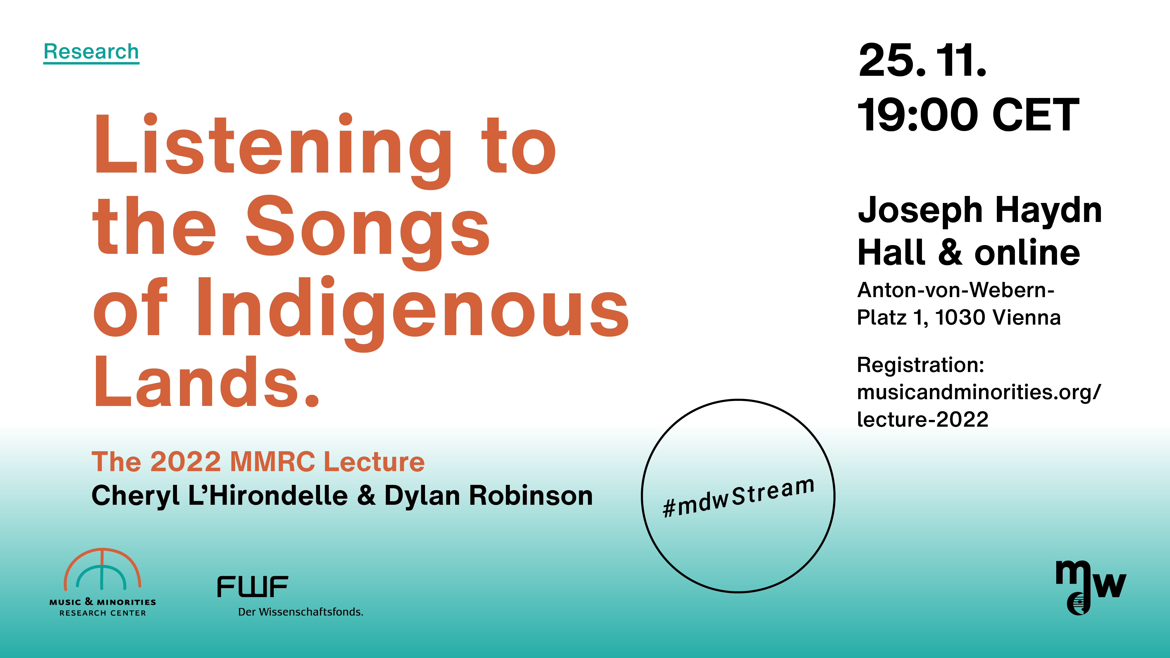 Fusing scholarly and artistic approaches, Dylan Robinson and Cheryl L'Hirondelle will explore the manifold dimensions of sound art by North American Indigenous artists and Indigenous song. The evening will feature works by Raven Chacon, Rebecca Belmore and Tania Willard. L’Hirondelle and Robinson will begin by presenting the work of Navajo artist and composer Raven Chacon. L’Hirondelle will open by singing a graphic score from Chacon’s multi-part composition For Zitkála-Šá. In turn, Robinson will discuss Raven Chacon’s public artwork Singing Toward The Wind Now / Singing Toward The Sun Now, pairing this with a discussion of Anishinaabe artist Rebecca Belmore’s public artwork Wave Sound. In these public artworks, we are presented with devices for listening to the land. The presentation will conclude with both Robinson and L’Hirondelle focusing on Secwepemc artist Tania Willard’s “Surrounded / Surrounding”, a work commissioned for the Soundings exhibition of Indigenous art scores, touring internationally until 2025. While Robinson will discuss the various material aspects of Willard’s installation and the ways in which it affirms forms of Indigenous gathering, L’Hirondelle will present a new premiere of the graphic score that is part of Willard’s installation.